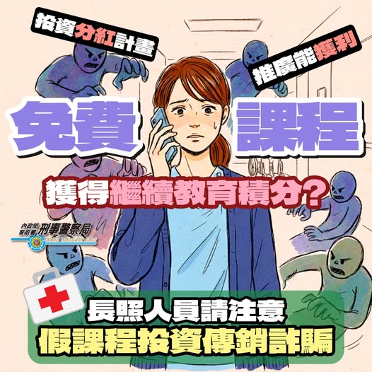 近期坊間出現不肖人士,假藉辦理長照人員「繼續教育課程」或相關培訓名義,實則招攬參與「免費課程」、「投資分紅計畫」、「推廣就能獲利」等活動;這類型態多為投資詐騙或多層次傳銷,長照人員務必小心查證,切勿輕信。