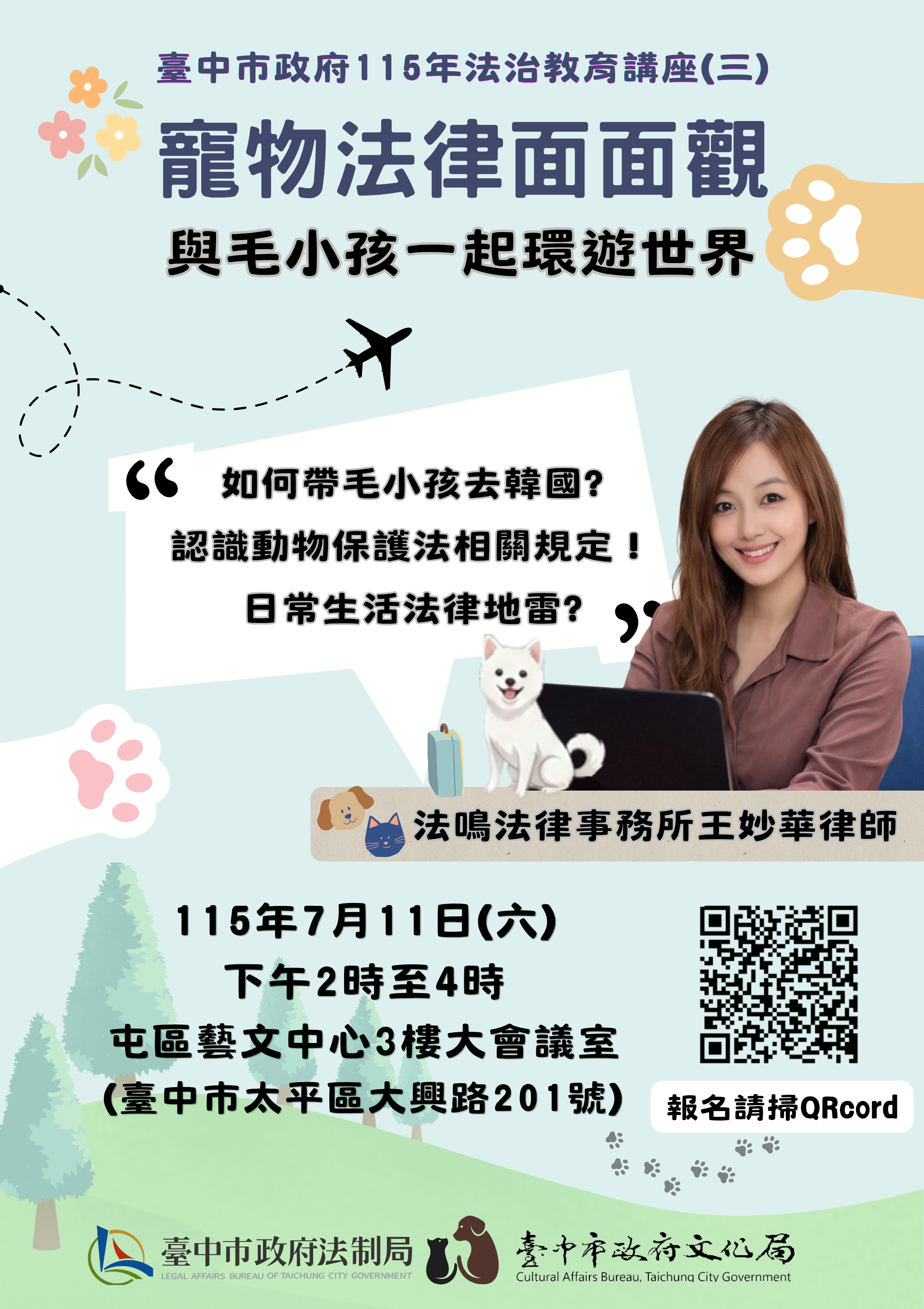 (一) 課程名稱:寵物法律面面觀-與毛小孩一起環遊世界。